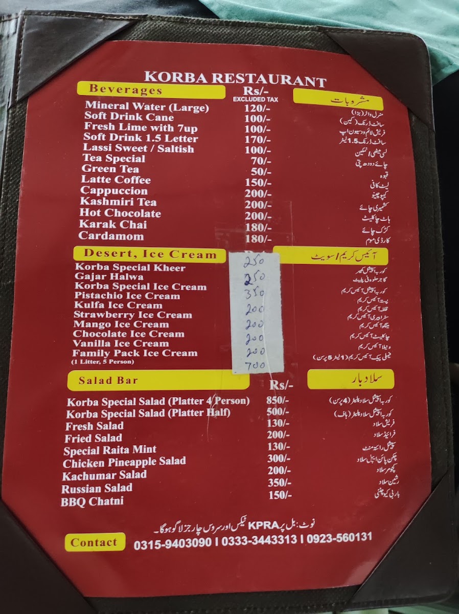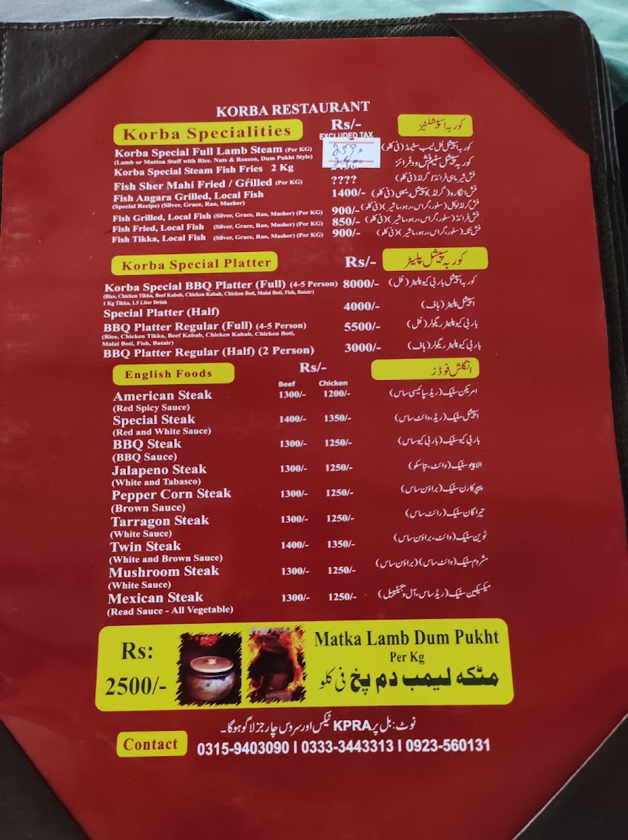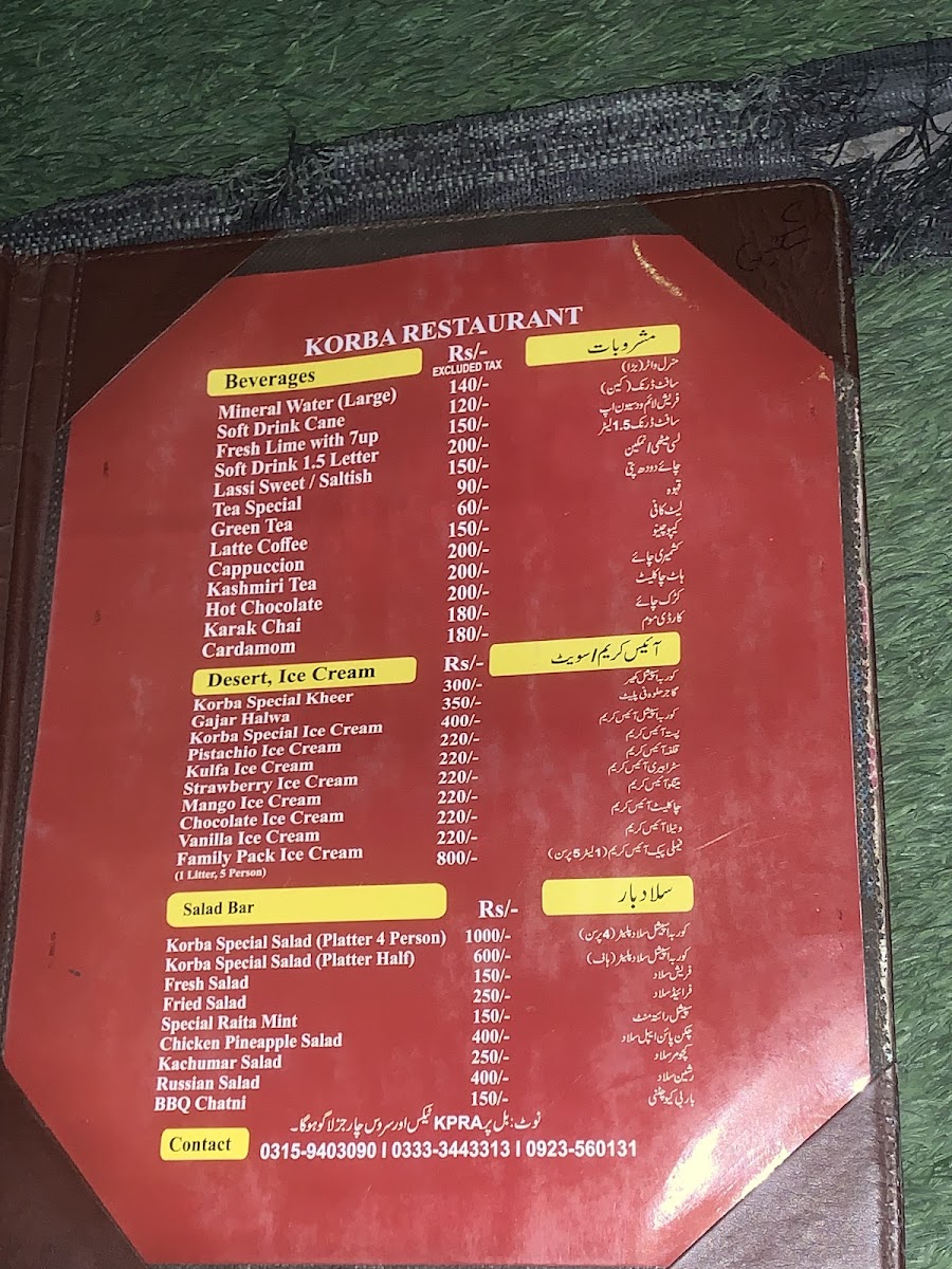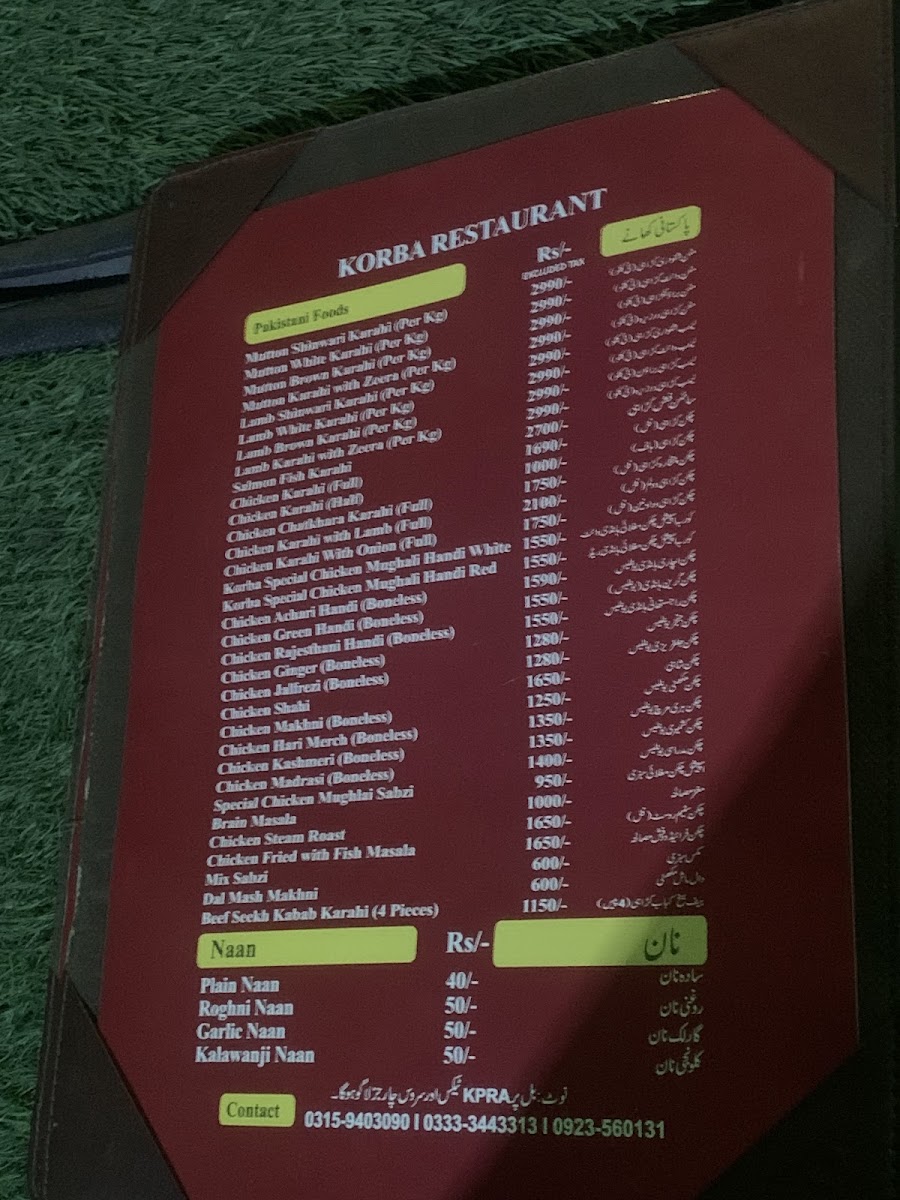 Korba Restaurant Menu
