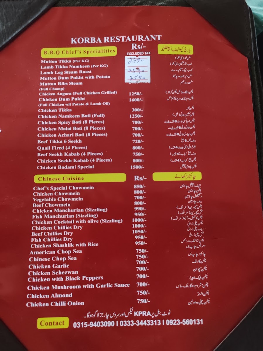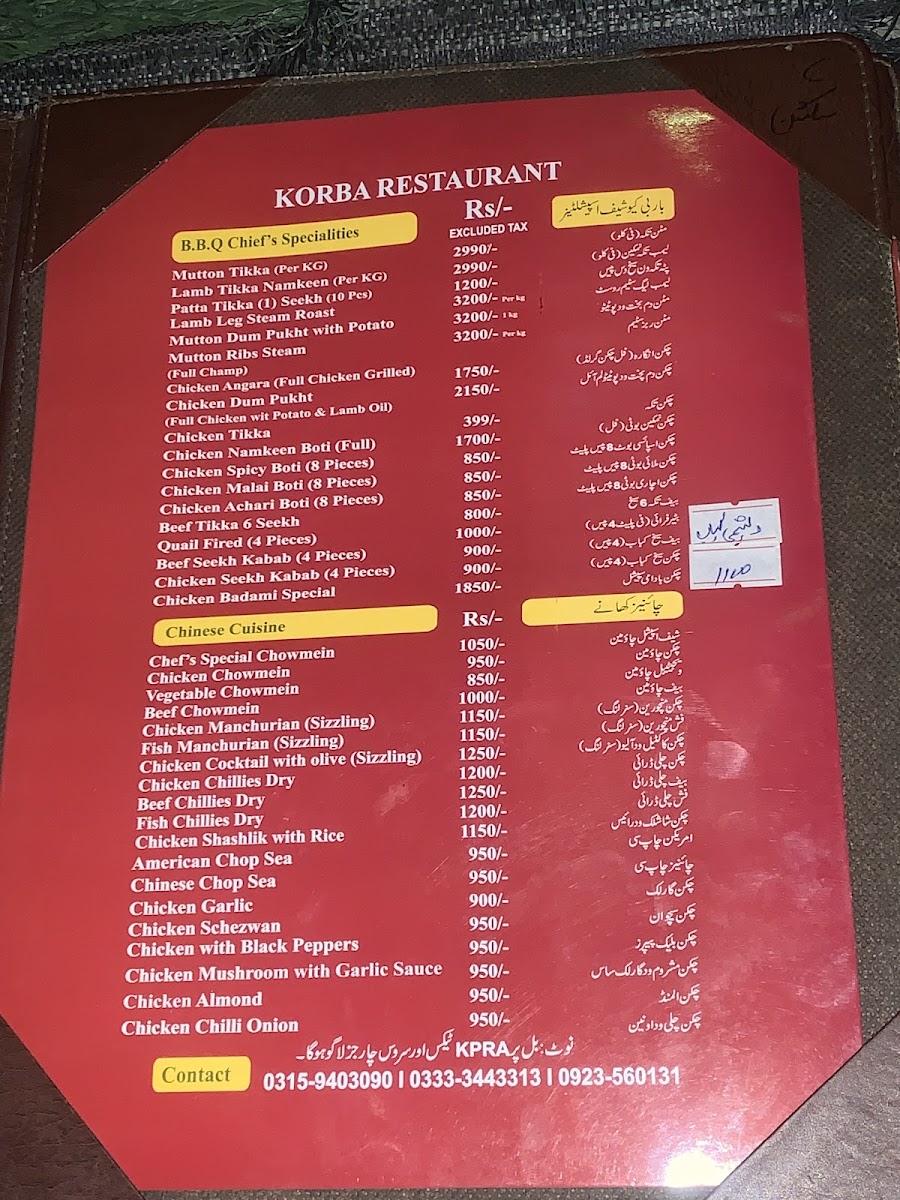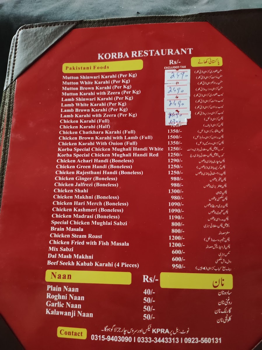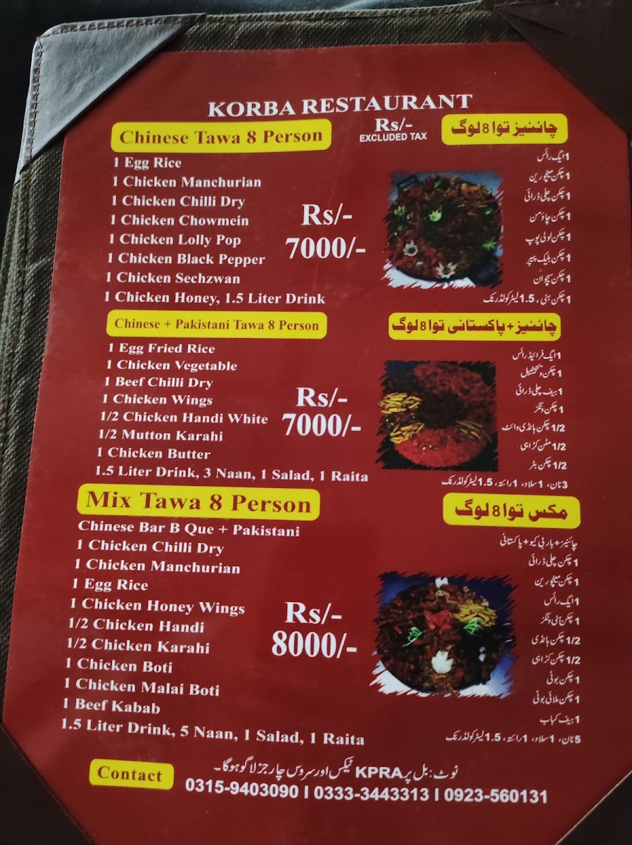 Korba Restaurant Menu